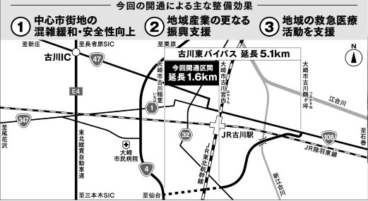 事業着手から約30年余りの一大プロジェクトにより、古川中心市街地の混雑緩和の切り札とのなるバイパスが「全線開通」しました。