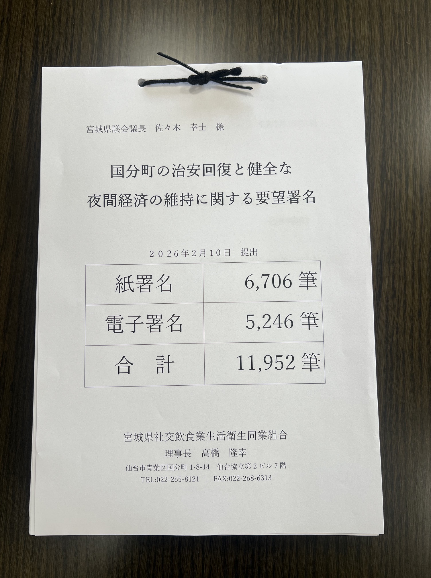このたび、「国分町における客引き行為等に対する治安対策の強化に関する陳情」を、宮城県社交飲食業生活同業組合の皆さまから受け取りました。