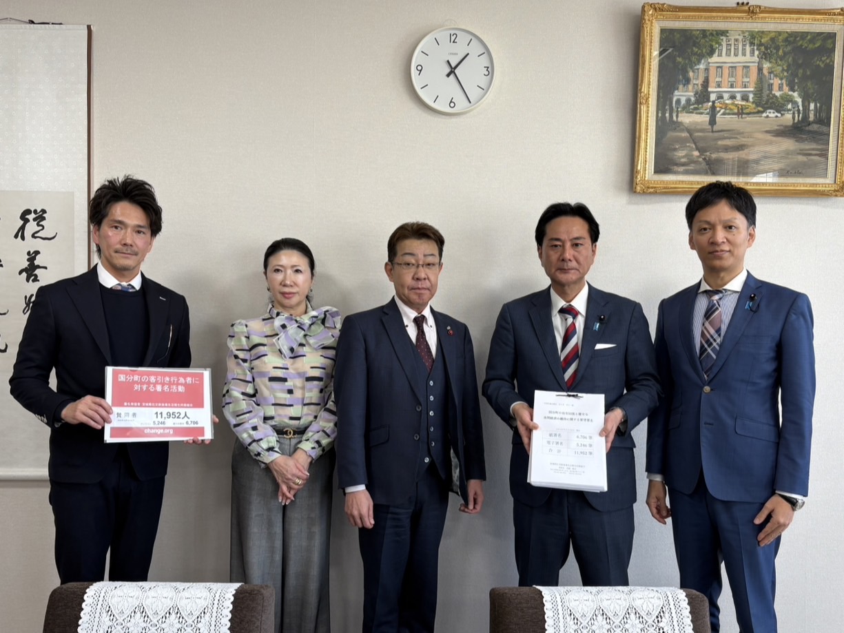 国分町では、客引き行為が常態化し、地域住民や事業者の皆さまから不安の声が高まっています。こうした状況を受け、国分町の治安回復と健全な夜間経済の維持を求める要望書には、11,952筆もの署名が寄せられ、宮城県および県議会へ提出されました。